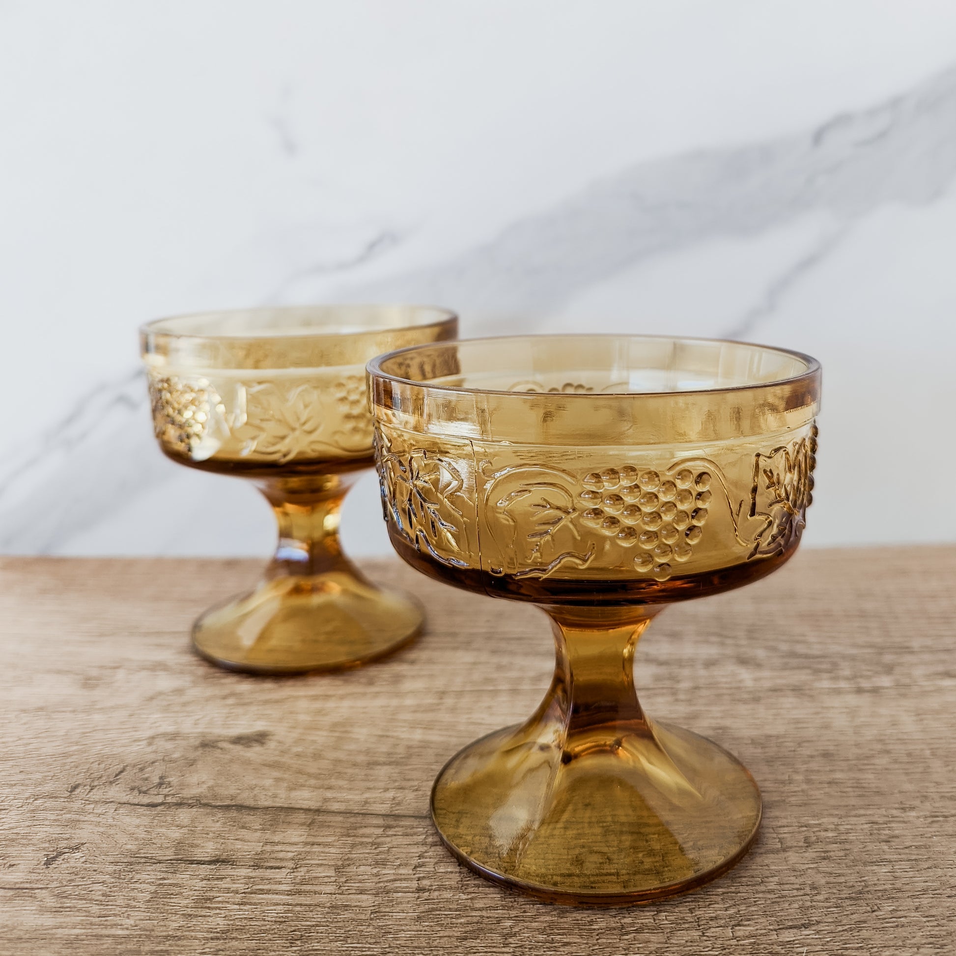 Mid-century amber glass dessert cups (set of 2), footed and with a grape vine pattern. These cups are in pristine condition, with no chips, cracks, or scratches. They would pair well with the L.G. Wright amber glass candy dish and the amber glass pitcher, while supplies last!
