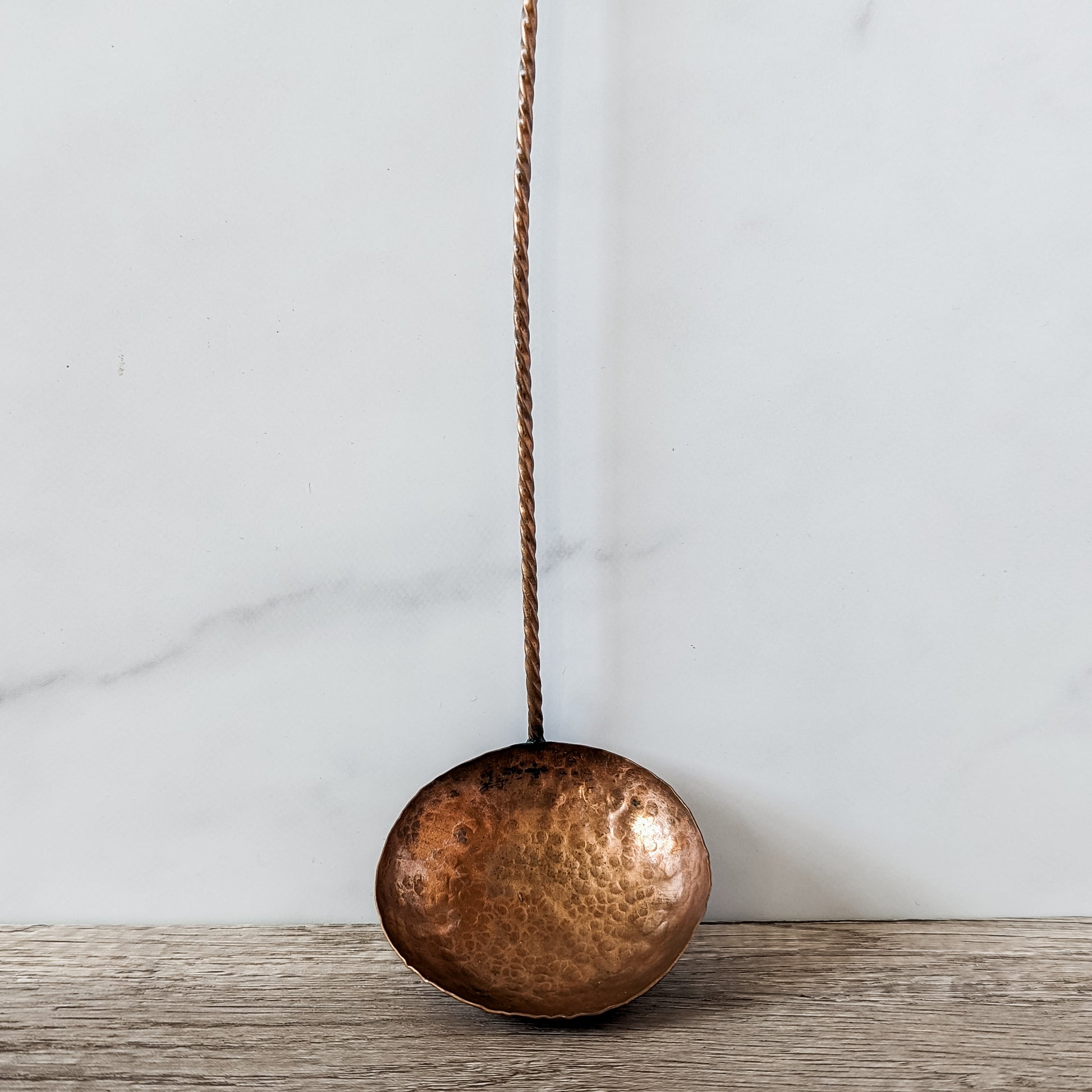 This adorable copper ladle has a hammered appearance on the spoon and a twisted appearance on the handle. It is a lightweight piece and in great used condition. The spoon itself is fairly small and can hold about 2.5 tablespoons of liquid. Pair with the copper suace pot to start your copper collection!