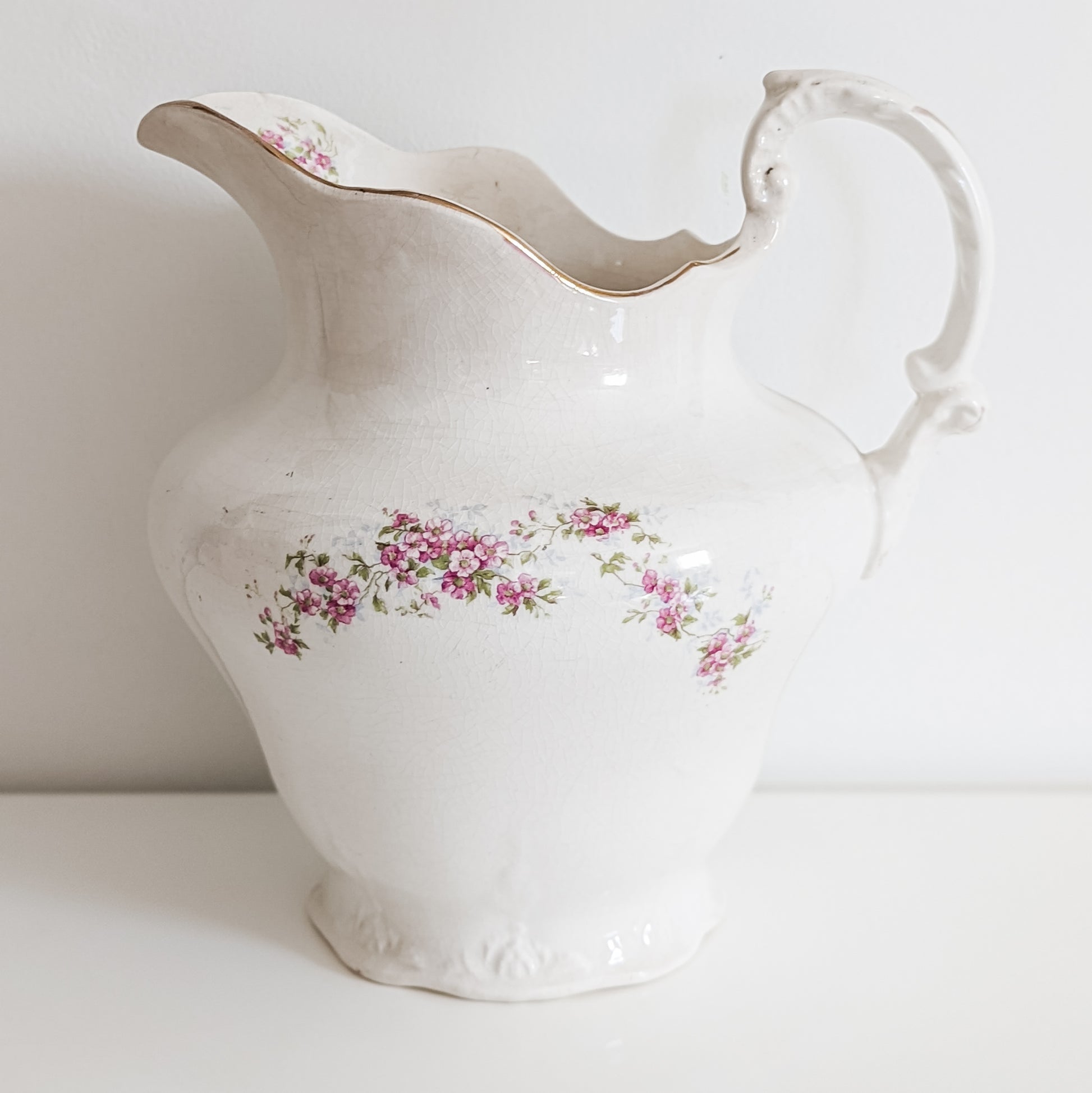 This gorgeous pitcher has the maker's mark of Edwin M. Knowles as shown in the photos. It has some crazing and slight discoloration/fading in some areas as expected from age, but is otherwise in wonderful condition! This is a timeless decorative pitcher with a gold-trimmed rim - perfect for your Springtime tablescape! This piece holds 2 quarts comfortably and pairs with the Edwin M. Knowles Scalloped-rim Bowl.