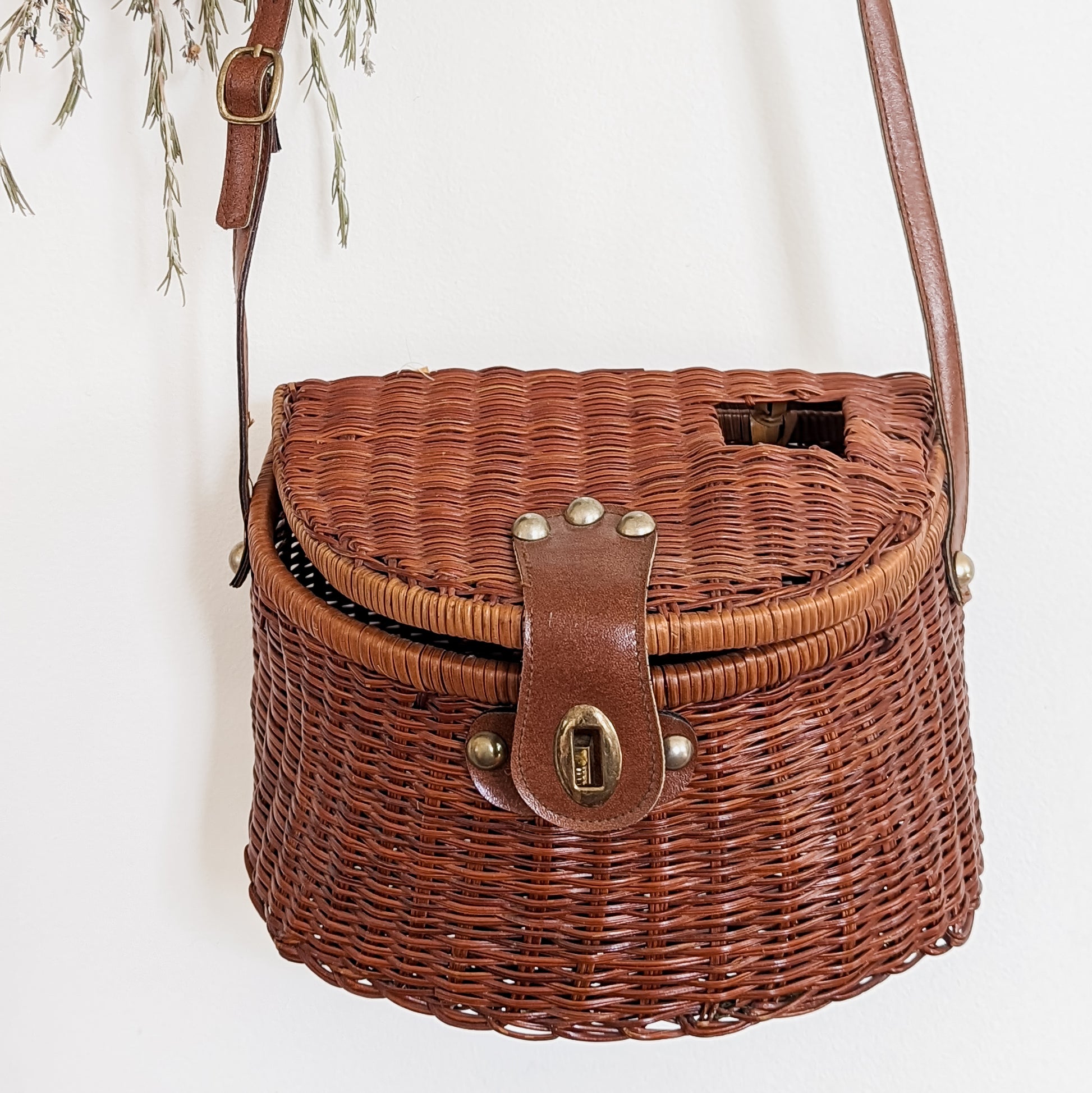 What is a creel basket, you may wonder? It is a basket fly fishermen used (and some still use) to keep their catch cool. It was often lined with moss and dipped into the cold waters of the creek or river. Caught fish were then inserted through the slot in the top and kept cool as the fisherman continued fishing. Luckily, this particular basket is in good vintage condition and does not smell fishy at all! There is some fraying of the adjustable leather strap and one side of the basket top has come loose and has been tied back together with fishing wire (please note photo #4). There is also a hard substance (glue?) in a few spots on the inside bottom of the basket. If you are not inclined to use this basket for fishing, it would make an excellent foraging basket!
