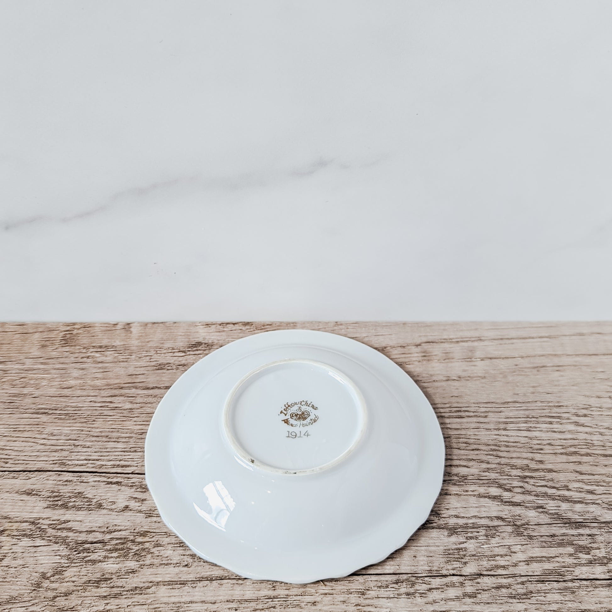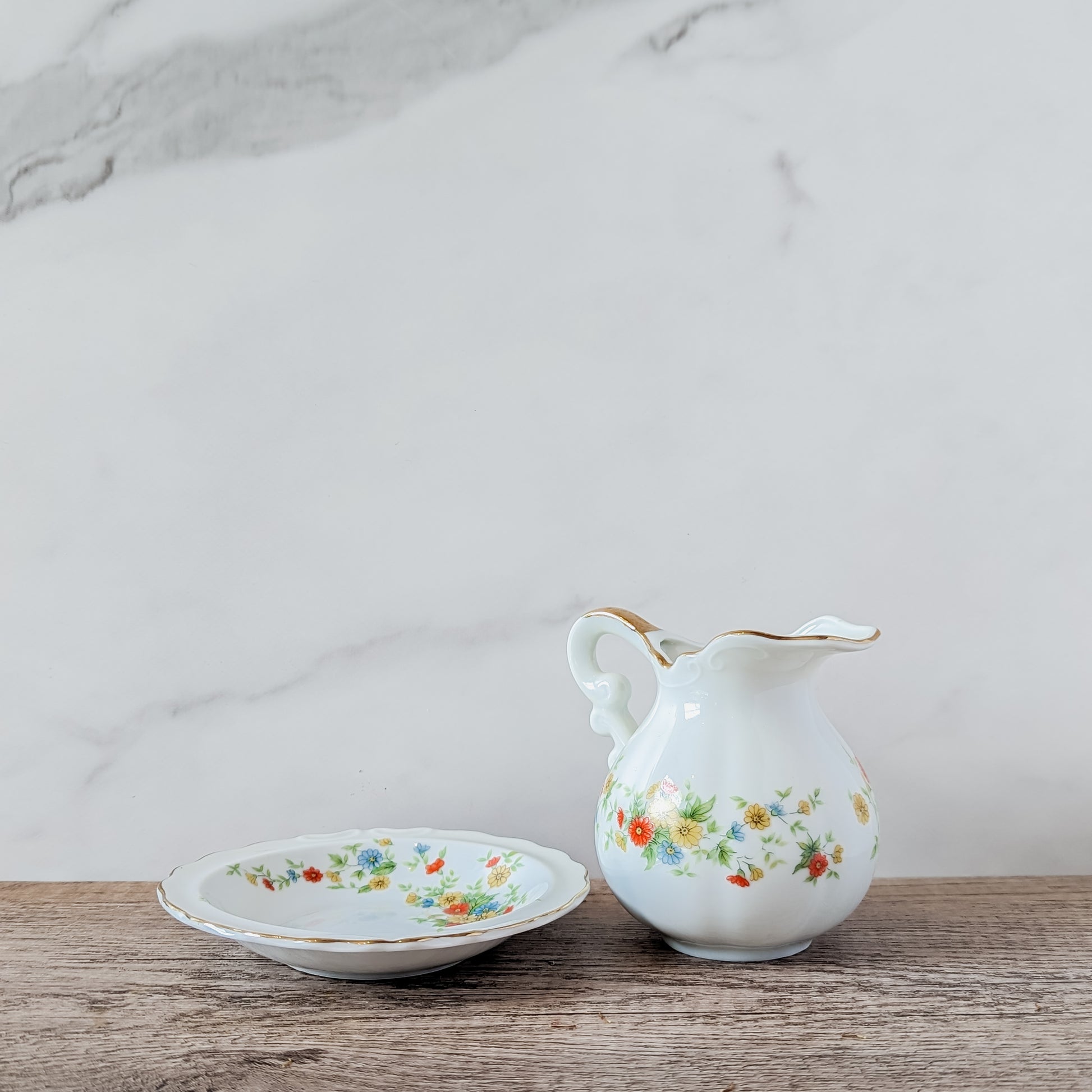 This Lefton China creamer and bowl / butter pat set is gold-rimmed and has been hand-painted in a gorgeous floral design. It is brand marked on the bottom and is in excellent vintage condition. This set can be used as designed, but it also makes for an adorable vintage flower vessel - miniature strawflower bundle is included!