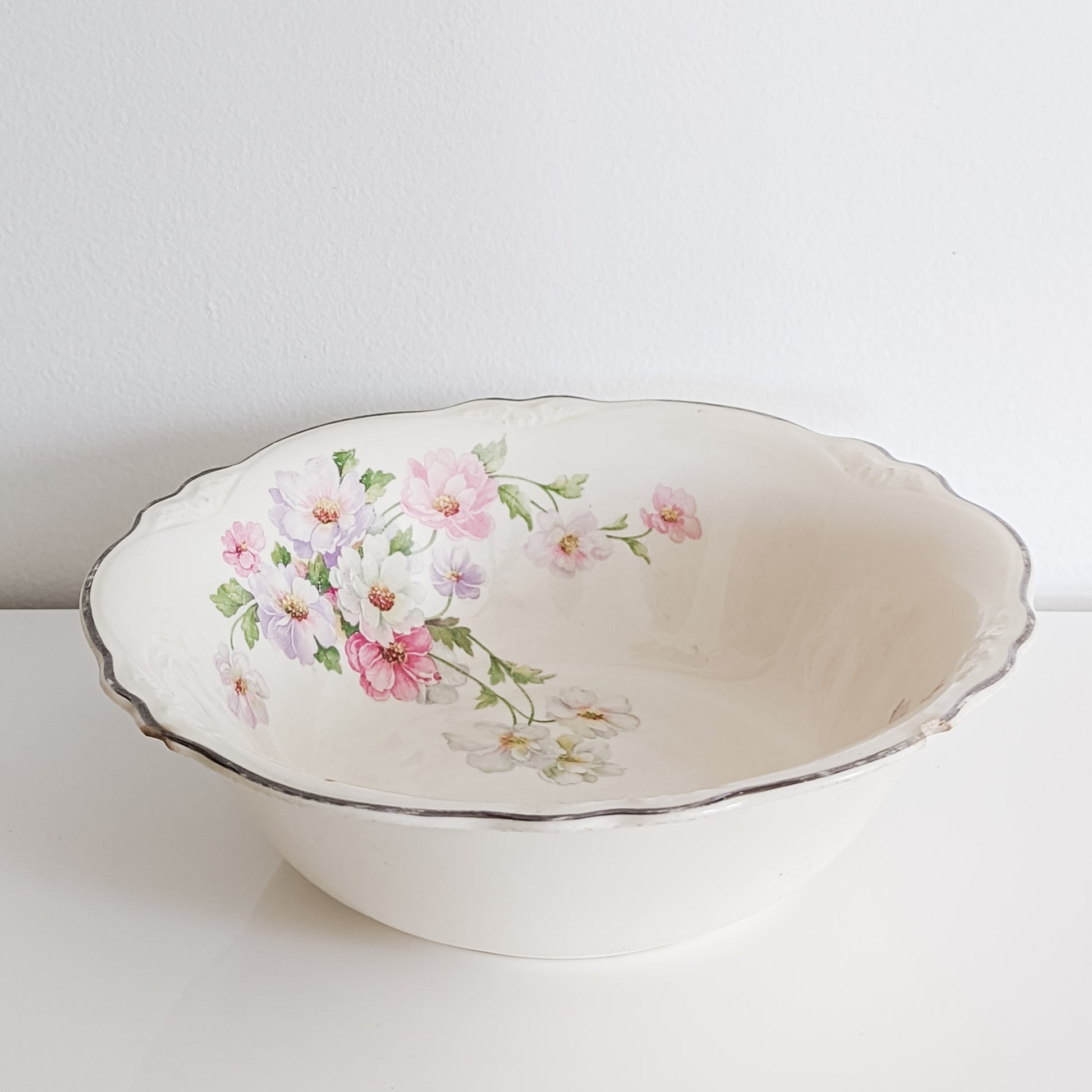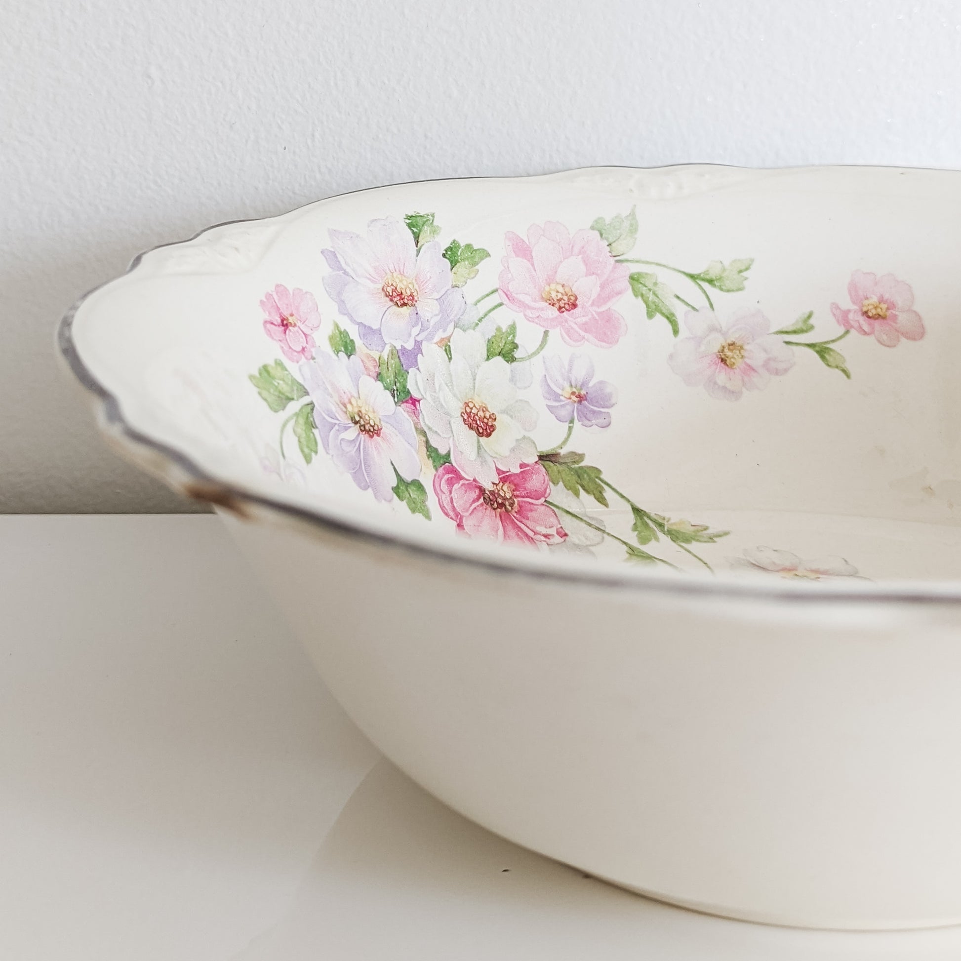 These beautiful Homer Laughlin serving bowls are in the "Virginia Rose" shape with a gorgeous pink floral pattern. They are silver rimmed with some discoloration/fading but surprisingly have very little crazing. There are no cracks but both have some chipping along the rims, as shown in the photos. They are otherwise in good vintage condition with a beautiful, creamy patina.