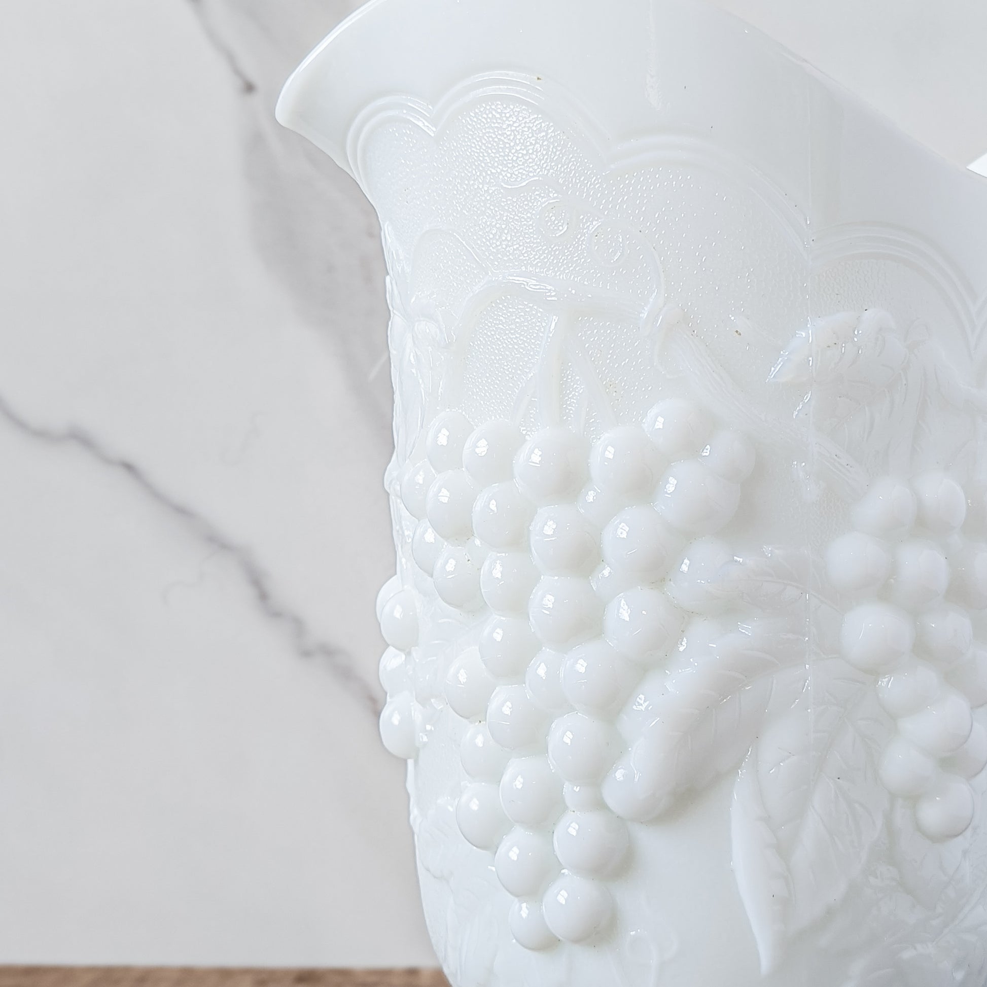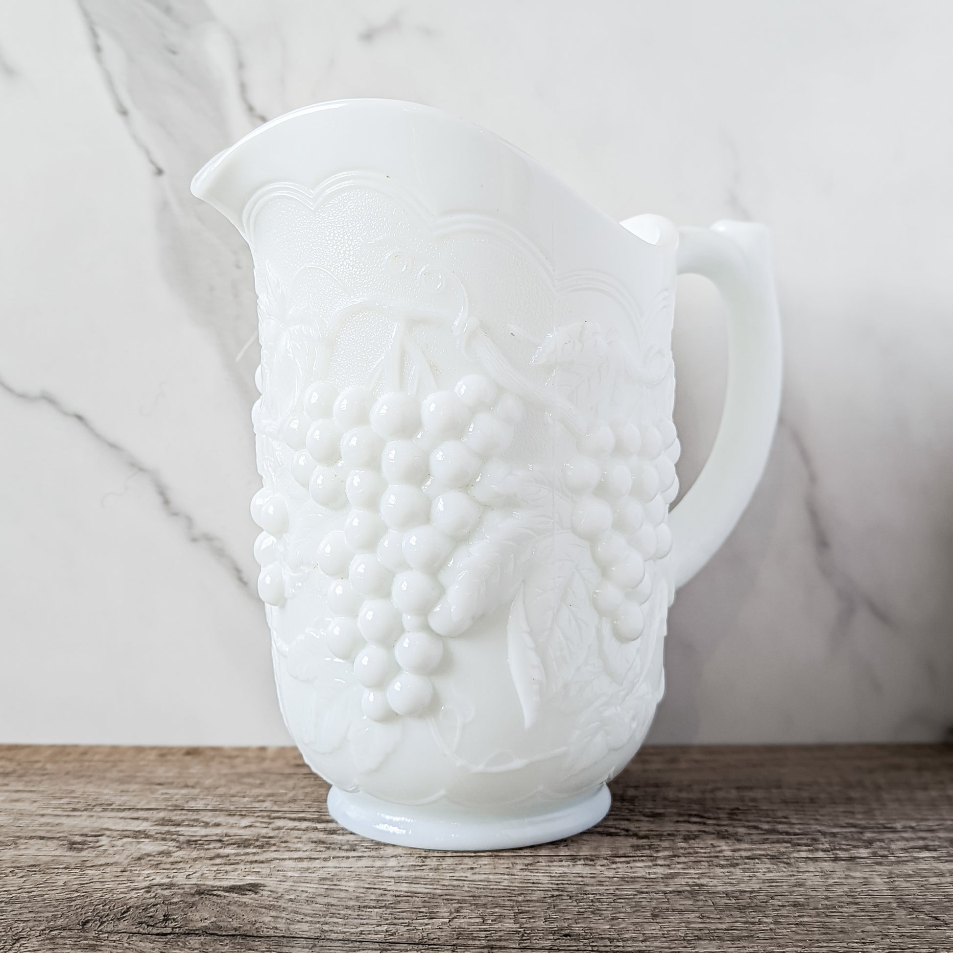 This milk glass pitcher, made by Imperial in the "Harvest Grape" pattern, is a weighty piece and in excellent vintage condition! It would pair well with other grape pattern milk glass pieces, such as Westmoreland Milk Glass "Paneled Grape" Candle Holders, the Milk Glass "Colony Harvest" Tea Cup and Snack Plates, or the Milk Glass Pedestal "Colony Harvest Bowl" for an adorable tablescape.