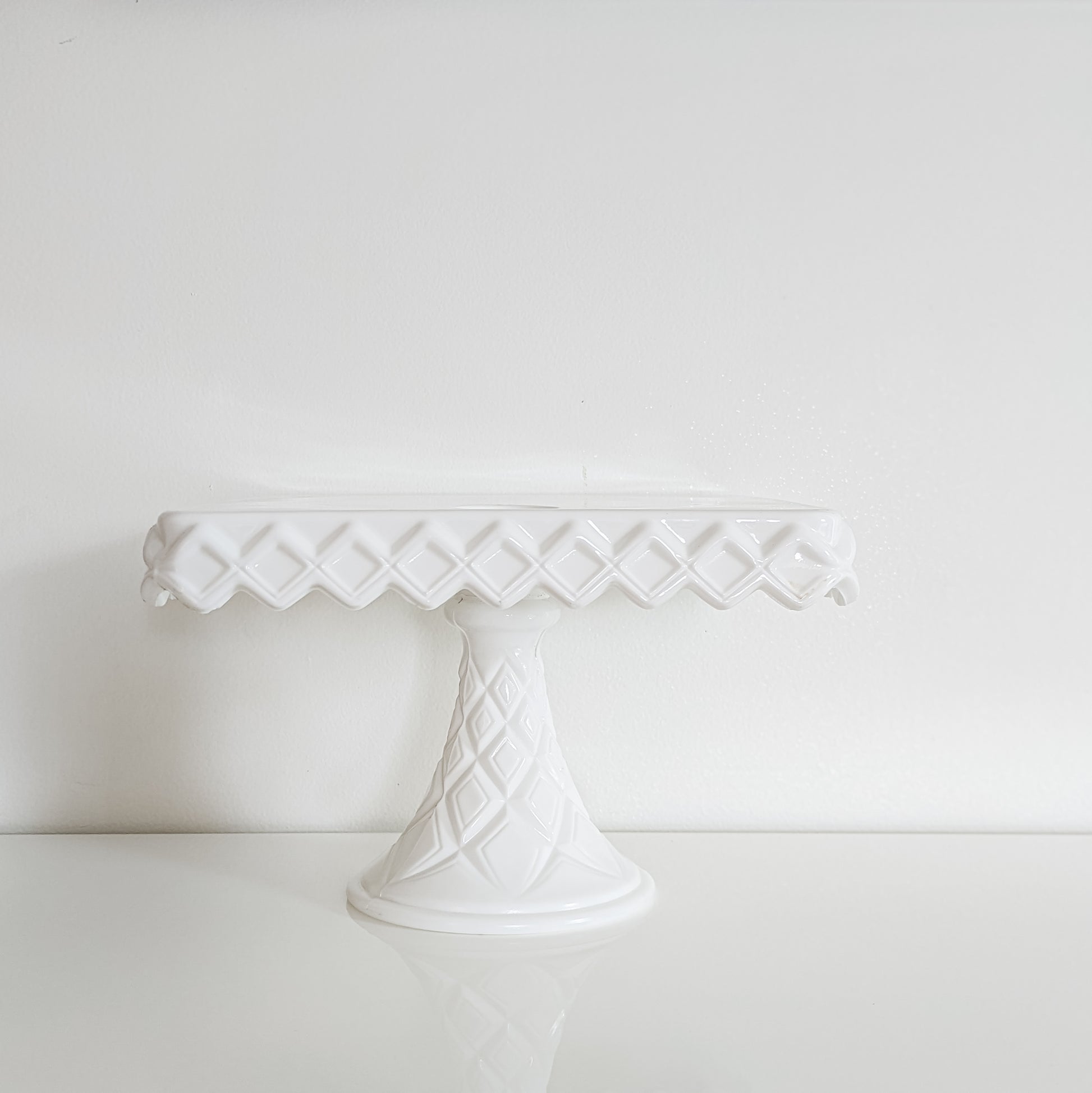 Circa the 1960's, this gorgeous Indiana / Colony Glass cake stand in the "Monterey" pattern would be a beautiful addition to a wedding or baby shower. In perfect vintage condition. Consider pairing with other milk glass pieces for a elegant milk glass tablescape!