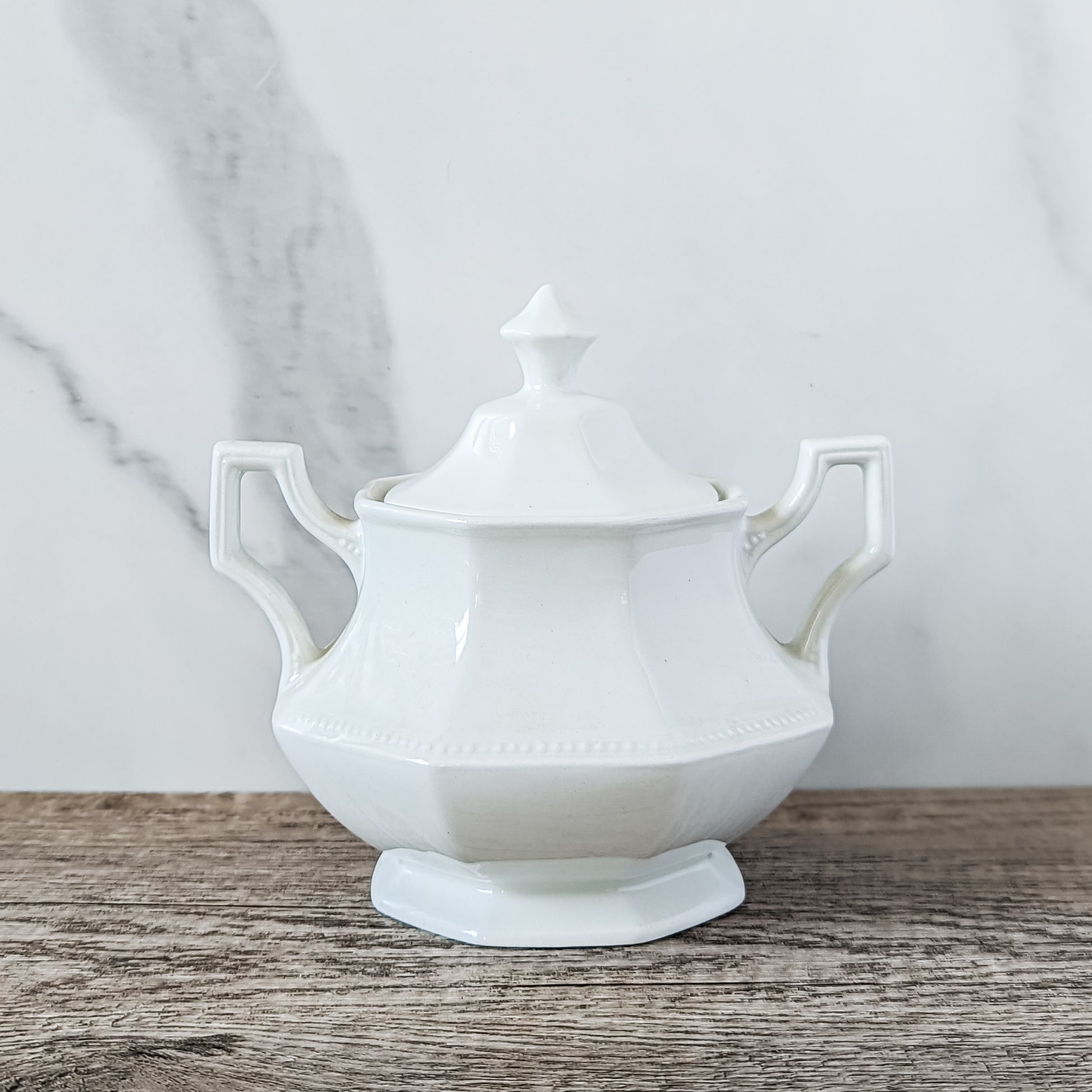 This Johnson Brothers white sugar bowl in the "Heritage" pattern is unbeatable in classic quality. Johnson Brothers began production of this collection in the early 1970's, which is why it has the more modern, octogonal style. This sugar bowl is crisp, clean, and classic! Consider pairing with the Johnson Brothers dish set of 6 (while supplies last!).