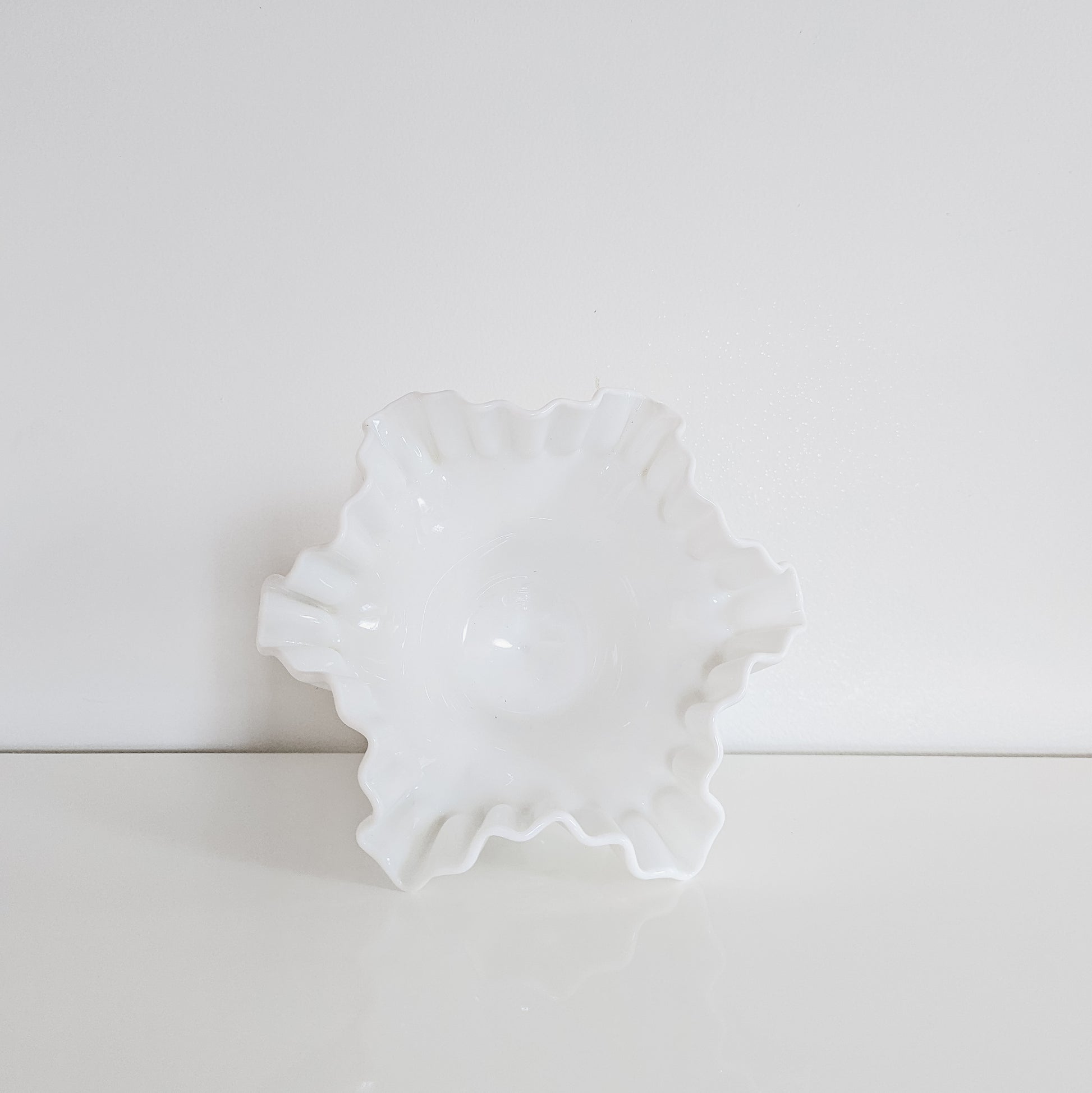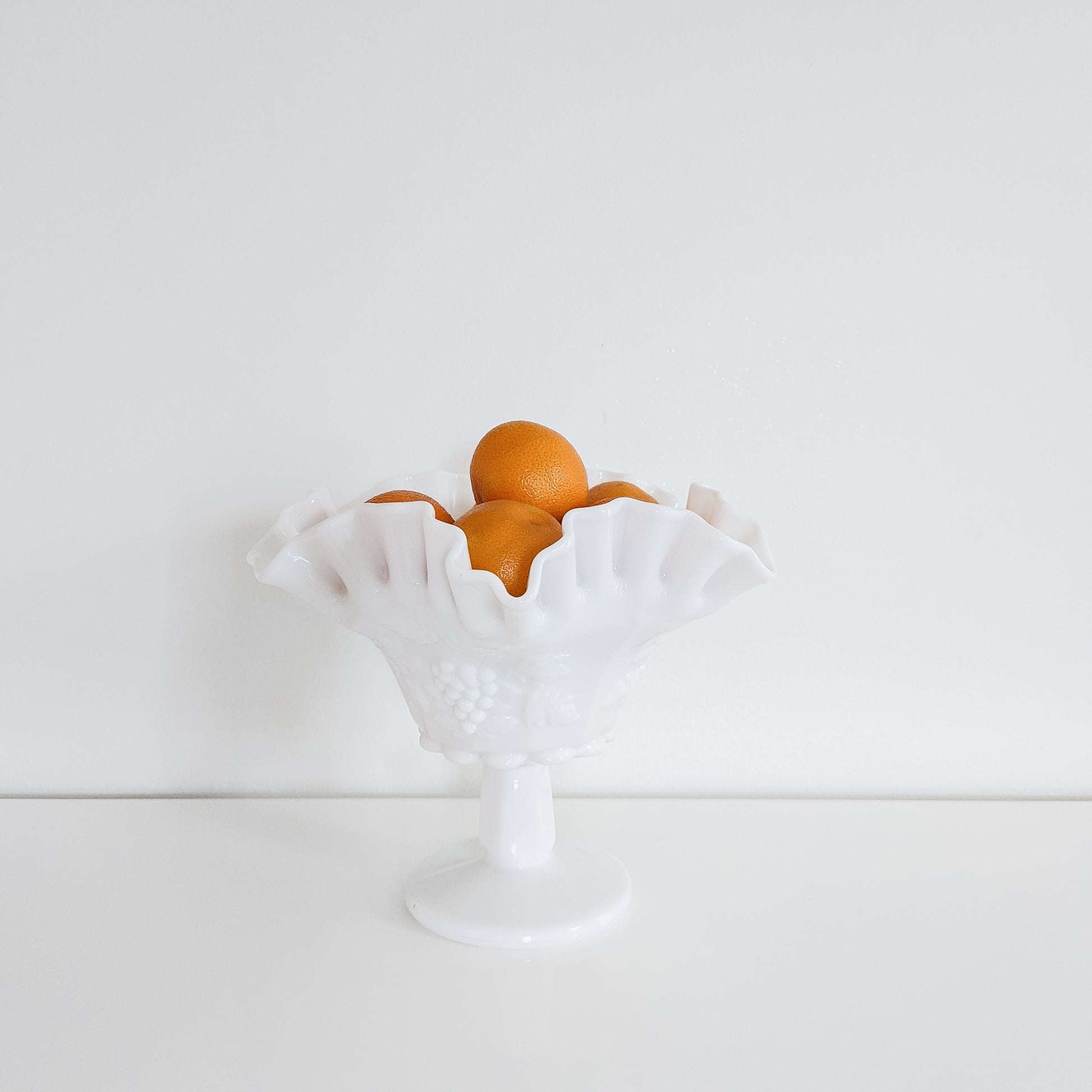 Circa 1950's, this Westmoreland"Paneled Grape" milk glass Compote stands on a pedestal foot and has a ruffled rim. It is marked with the classic "WG" on the bottom. Excellent condition with no chips, cracks, or scratches. Consider using this piece as a dining table centerpiece or as a small fruit holder on your kitchen island.