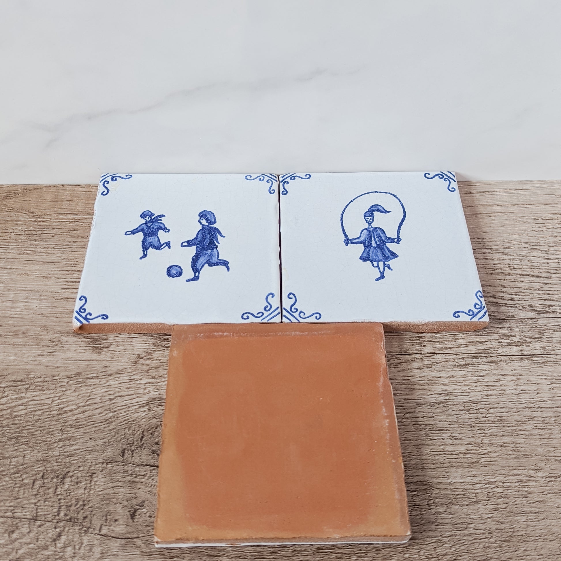 These adorable Dutch tiles depict children at play in a Delft style. There are no markings or backstamps to confirm maker, but they are in excellent condition with crazing that only adds to the patina.