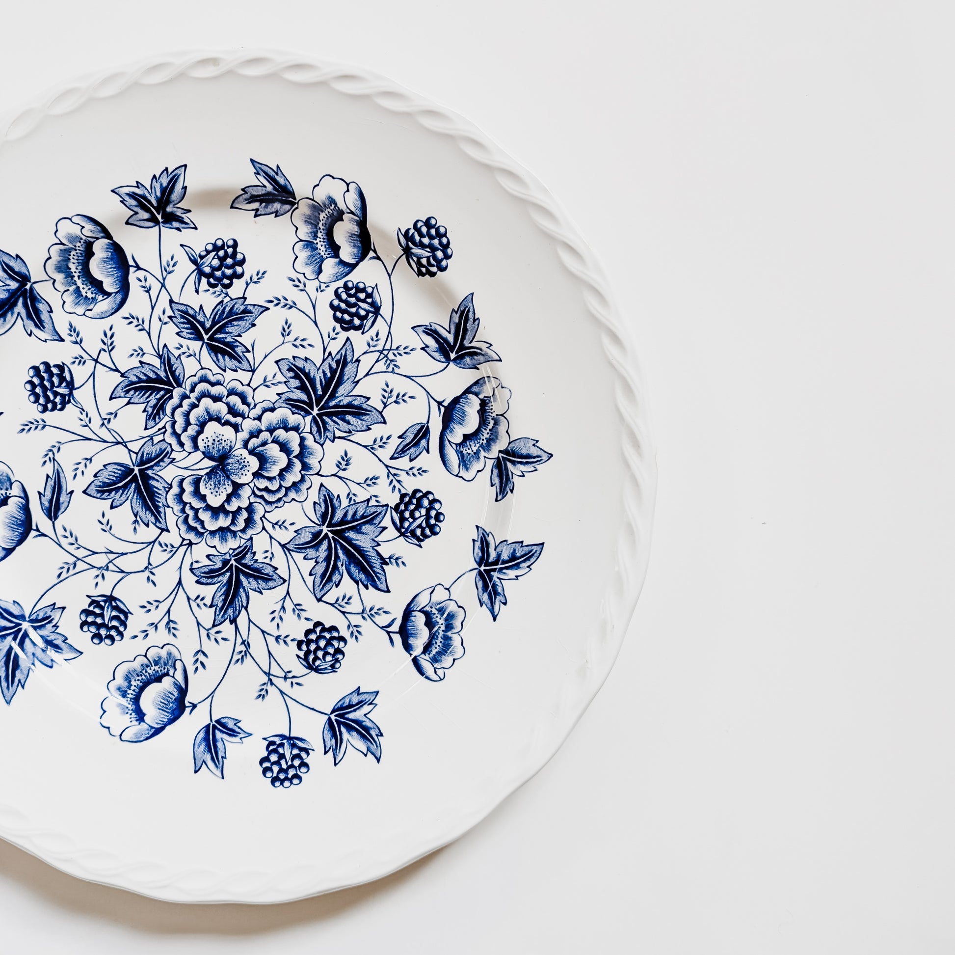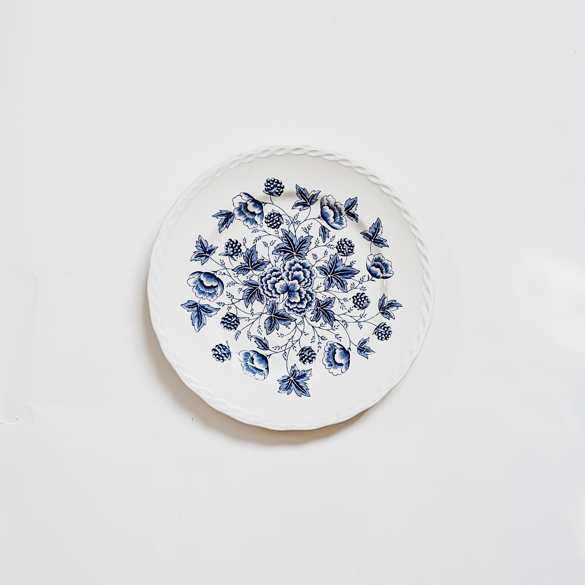Fine Staffordshire ironstone from England. Made by W.H. Grindley in the "Old Chelsea" pattern. As antique items, there is some slight fading and discoloration. There is also some crazing on both dishes, which I believe adds to the patina. As noted in the photos, there are small chips on the backside of each plate, along the rim. These chips are hardly noticeable when looking at the face of the plate, but they are noticeable when looking from the side. Please examine the photos carefully. These "flaws" represent a story told over time and across family tables. Otherwise in good condition.